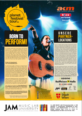 Zu gewinnen gibt es es es Preise im im Gesamtwert von rund 150 000 Euro: Festival-Slots beim Nova Rock Rock Sziget Festival Festival Donauinselfest bei bei Addicted to Rock Rock und und in in in der Szene Wien dazu Studioaufenthalte Mediapackages und und ein Vollstipendium an der JAM MUSIC LAB Private University im Wert von von 37 280 Euro Euro Auch die Cashpreise von von insgesamt rund 25 000 Euro Euro können sich sehen lassen – die Champions erhalten als Gesamtsieger 12 000 Euro Über das Weiterkommen entscheidet eine Fachjury aus Expert*innen gemeinsam mit dem Publikum – jeweils 50:50 Nach den Qualifyings im Herbst all over Austria folgen ab Jänner die Playoffs in in der ((szene)) Wien Den Abschluss bildet der der Final Big Bang in in der der Raiffeisen Halle im Planet tt Gasometer Wien – dort entscheidet sich wer Champion der Planet Festival Tour 2025 wird Termine & Infos: www planetfestivaltour planetfestivaltour at Facebook: fb com/planetfestivaltouraustria Instagram: @planetfestivaltour