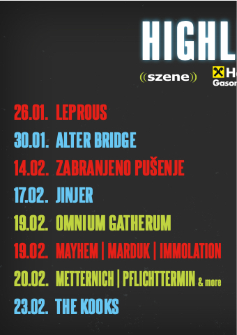 26 01 LEPROUS 30 01 ALTER BRIDGE 14 02 ZABRANJENO PUĊ ENJE 17 02 JINJER 19 02 OMNIUM GATHERUM 19 02 MAYHEM | | MARDUK | | IMMOLATION 20 02 METTERNICH | PFLICHTTERMIN & more 23 02 THE KOOKS